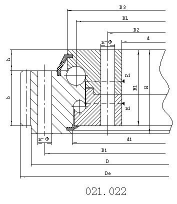 雙排球式回轉支承具有三個座圈,鋼 球和隔離塊可直接排入上下滾道,根據受力狀況,安排了上下兩排直徑不同的鋼球。這種開式裝配非常方便,上下圓弧滾道的承載角都為90°,能承受很大的軸向 力和傾翻力矩。當徑向力大于0.1倍的軸向力時滾道須特殊設計。雙排球式回轉支承的軸向、徑向尺寸都比較大,結構緊固。特別適用于要求中等以上直徑的塔式 起重機,汽車起重機等裝卸機械上。